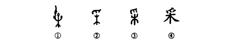 這是“花榮堪采”的“采”字,是個(gè)會(huì )意字。甲骨文①的上部是一只手(爪),下部是一棵樹(shù),樹(shù)上的小圓圈表示果子,真是枝葉繁茂,碩果累累。手在果上表示采摘。②是金文形體,大體上與甲骨文相似,只是果形省掉了。③是小篆形體,與金文基本相同。④是楷書(shū)的寫(xiě)法,由小篆直接演變而來(lái)。