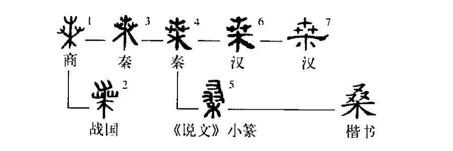 ,兩側的枝葉與樹(shù)形脫離。至秦代文字(字形4)及《說(shuō)文》小篆,枝葉已完全與樹(shù)形脫離,前者變從“芔”,后者變從“叒”。“桑”,本義是桑樹(shù)。《說(shuō)文》:“桑,蠶所食葉木。”《詩(shī)·小雅·小弁》:“維桑與梓,必恭敬止。”朱熹集傳:“桑、梓二木,古者五畝之宅,樹(shù)之墻下,以遺子孫給蠶食、具器用者也。” (按:后世以“桑梓”為故里,源出于此。)晉陶潛《歸園田居》五首之二:“相見(jiàn)無(wú)雜言,但道桑麻長(cháng)。”也指桑葉。《詩(shī)·衛風(fēng)·氓》:“桑之落矣,其黃而隕。”漢王充《論衡·商蟲(chóng)》:“夫蟲(chóng)食谷,自有止期,猶蠶食桑,自有足時(shí)也。”引申指采桑。《詩(shī)·魏風(fēng)·十畝之間》:“十畝之間兮,桑者閑閑兮。” 《漢書(shū)·外戚傳·元后》:“率皇后列侯夫人桑。”顏師古注:“桑,采桑也。”又指種桑養蠶。《漢書(shū)·食貨志上》:“故務(wù)民于農桑,薄賦斂,廣蓄積,以實(shí)倉廩。”(冀小軍)
