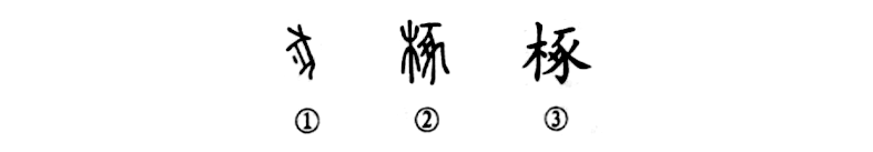 這個(gè)“椓”讀作zhuó,本為象形字。甲骨文①是一頭腹朝左、背朝右、頭朝上、尾朝下的豕(豬),腹部的小點(diǎn)是表示公豬的生殖器已被割下。②是小篆的形體,即在“豖”的左邊加“木”,表示以木將生殖器枷掉。由原來(lái)的象形字變?yōu)闀?huì )意兼形聲的字。③是楷書(shū)的寫(xiě)法。
