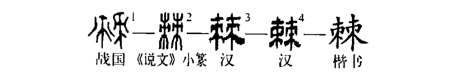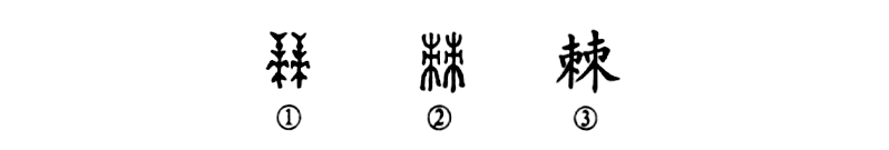 這是“荊棘叢生”的“棘”字,讀作jí,本為象形字。①是金文的形體,就是兩株酸棗樹(shù),全身都長(cháng)著(zhù)刺。②是小篆的形體,與金文相似。③是楷書(shū)的形體。
