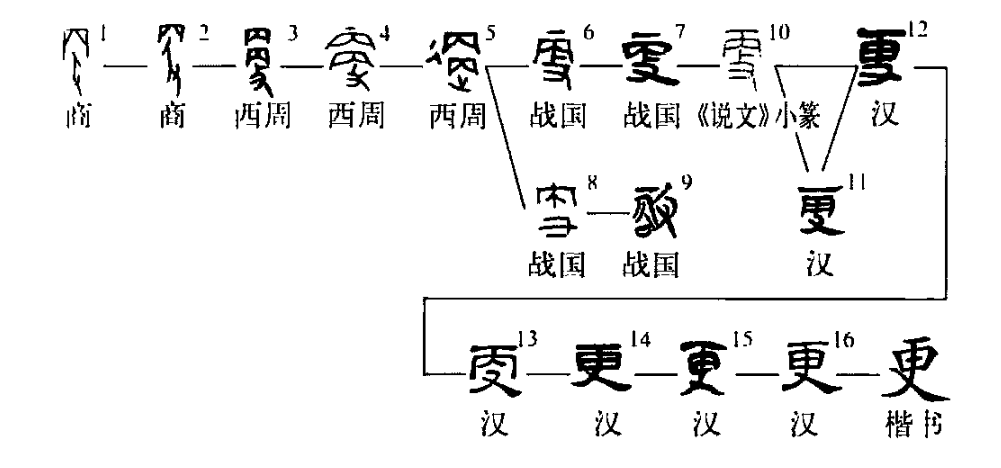 形聲字。從攴,丙聲。形旁攴為手持器械治事?tīng)?,表示更字本義與治事有關(guān);聲旁丙為象形字(像魚(yú)尾、器物底座、幾形等,無(wú)定說(shuō)),于更字表聲,丙與庚并陽(yáng)部。更字始見(jiàn)于甲骨文,至西周金文丙上又重出一丙為聲,有的丙上加一橫為飾筆,形旁攴亦或加飾筆作