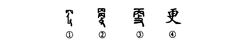 “一夜連雙歲,五更分二年。”這個(gè)“更”字本為形聲字。①是甲骨文的形體。上部是“丙”,表聲;下部是“攴”,表形,即像手握馬鞭的形狀。于省吾先生認為:“更即古文鞭字。”②是金文的形體,上部又增加了一個(gè)“丙”字,其義未變。③是小篆的形體。④為楷書(shū)的寫(xiě)法。