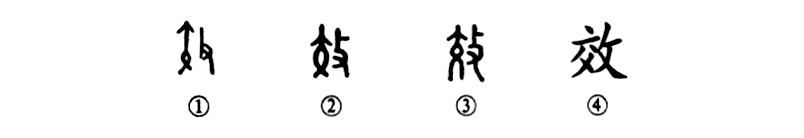 這是“效法”的“效”字,是一個(gè)會(huì )意兼形聲的字。甲骨文①的左邊像兩腿相交、正面立著(zhù)的一個(gè)人。其右是一只手,拿著(zhù)一條教鞭在鞭打左邊的人。這就類(lèi)似在舊教育制度下,用教鞭打學(xué)生,逼迫學(xué)生學(xué)習。所以“效”字是“摹仿”或“學(xué)習”的意思。②是金文形體。小篆③的形體是由甲、金文字的形體直接演變而來(lái)的。④是楷書(shū)的寫(xiě)法。