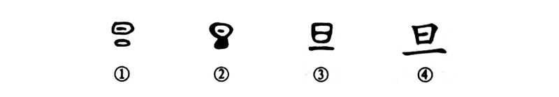 《木蘭詩(shī)》:“旦辭爺娘去,暮宿黃河邊。”可見(jiàn)“旦”與“暮”是相對的,“旦”是早晨,“暮”是晚上。甲骨文①的上部是“日”,下面的部分表示地面或水面。金文②是海上看日出的樣子,火紅的太陽(yáng)剛跳出海面,其下部水日相連,好像還有半個(gè)太陽(yáng)在水中。③是小篆的形體,“日”下部分變成了一條線(xiàn)。④為楷書(shū)形體。