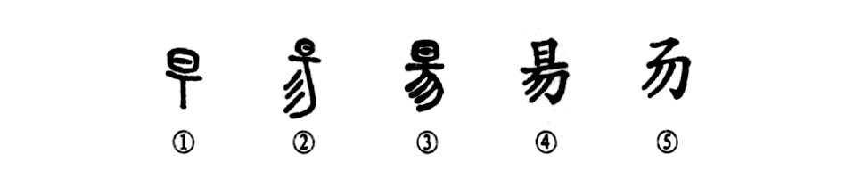 這個(gè)“昜”字讀作yáng,本為象形字。①是甲骨文形體。朱芳圃先生認為,該字上部的“日”是“燈缸也”。也就是說(shuō),“昜”本為燈形,表示“光明”義。②是金文的形體,下部的“彡”像“燈光之下射也”。③是小篆的寫(xiě)法,與金文相似。④為楷書(shū)形體。⑤為簡(jiǎn)化體,僅作偏旁用。