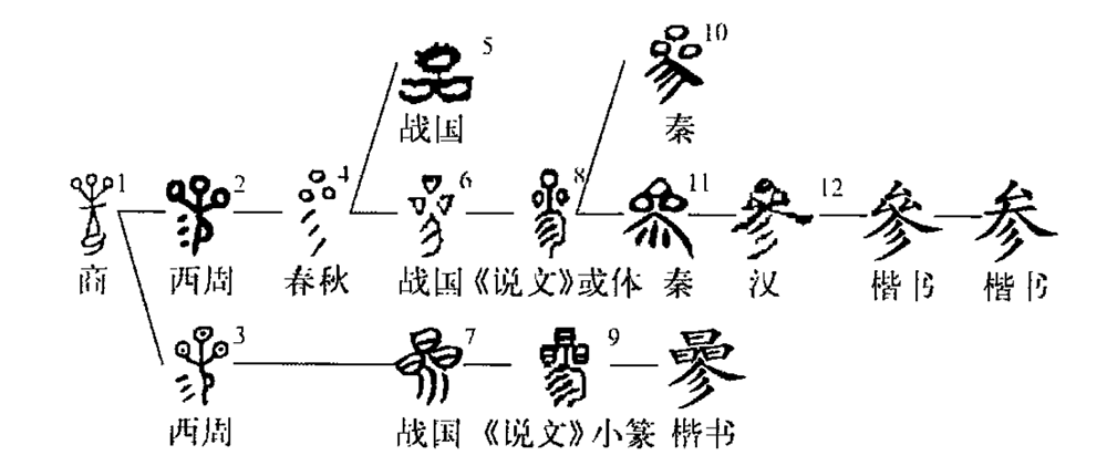 ,曑或省。”所從字形略有訛變,后隸變?yōu)?ldquo;參”?!墩f(shuō)文》所訓實(shí)際上是“動(dòng)如參商”之“參”的本字,為星宿之名。此音為shēn。一般訓為“參與”、“參互”、“混同”等義的“參”則音cān。如《莊子·在宥》:“吾與日月參光。”而“參差”之“參”則音cēn。又假借為“驂”,如《史記·魏世家》:“韓康子為參乘。”一般稱(chēng)為“人參”的“參”其本字則為“薓”。而“參雜”的“參”則又為“糝”字的假借。此外,“參”又假借為“摻”、“椮”、“嵾”、“傪”、“岑”等。“曑”、“參”今皆簡(jiǎn)化為“參”。(王志平)