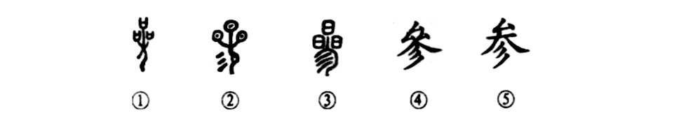 這是“人生不相見(jiàn),動(dòng)如參與商。”的“參”字,本為象形字。①是甲骨文的形體,下部為人形,人上有三顆星,表示參星高照。②是金文的形體。星的左下方有“彡”,表示星的光芒。朱芳圃說(shuō):“參象參宿三星在人頭上,光芒下射之形。”③為小篆的形體,與金文相似。④為楷書(shū)繁體字。⑤為簡(jiǎn)化字。