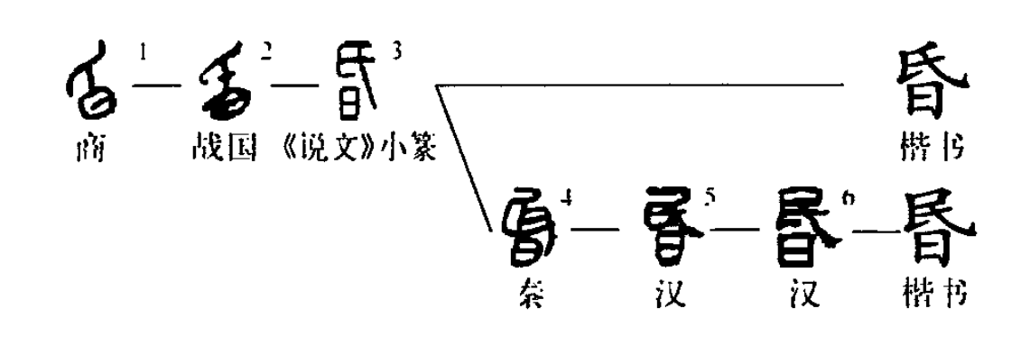 會(huì )意字。初文從日,從氏,或從氐;古文字“氏”、“氐”本為一字。“氏”或“氐”有落下的意思,日落就是“昏”。后來(lái)“氏”或“氐”字亦訛變?yōu)?ldquo;民”字。甲骨文:“今日辛至昏雨。”(《合集》29328)《說(shuō)文》:“昏,日冥也。從日,氐省。氐者,下也。一曰民聲。”“昏”古音與“民”字接近,故也從“民”得聲。“昏”字的本義就是“日落”、“日沒(méi)”,后由此引申出“夜晚”、“黑暗”等義。“昏”字經(jīng)常假借為“惛”,所謂“昏亂”、“昏迷”、“昏庸”等都由此引申而來(lái)。也經(jīng)常假借為“婚姻”之“婚”,而“昏勉”之義的“昏”則為“敃”字的通假。用為“宦官”之“昏”實(shí)際上是“閽”字,而還沒(méi)有起名就死去了也叫“昏”,則又是“殙”的假借字了。(王志平)