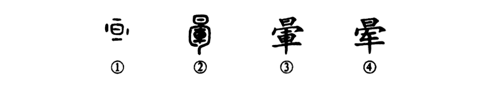我們看甲骨文①的形體,大概能得知其義,中間是個(gè)“日”(太陽(yáng)),周?chē)莻€(gè)光圈。小篆②只保留了“日”字,而它的下部則加了個(gè)“軍”字表示讀音,這就成了“從日軍聲”的形聲字了。③是楷書(shū)的形體,是直接由小篆變來(lái)的。④是簡(jiǎn)化字,僅把“軍”字簡(jiǎn)化為“車(chē)”罷了。