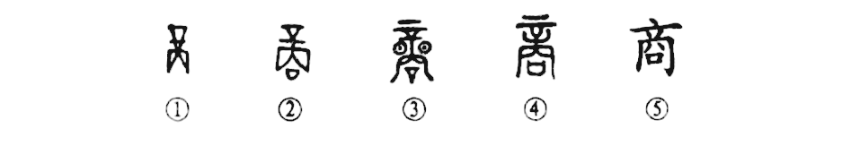 “置酒望白云,商飆起寒梧。”這個(gè)“商”字原為會(huì )意字。①是甲骨文的形體,下部是祭祀時(shí)所設的靈臺,其上置薪,焚燒而祭天。這是殷商人的習慣。②是金文的形體,下面增加了一個(gè)“口”。③是籀文的形體,中間又增加了兩個(gè)“星”形,象征大火之星,即為商星(星名)。④是小篆的形體,省去星形。⑤為楷書(shū)的寫(xiě)法。