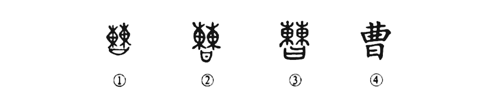 ”,后又連通頂部?jì)蓚€(gè)短橫,最后合并中間兩個(gè)短豎,全字成為“曹”形。漢代還有承戰國簡(jiǎn)化形式“