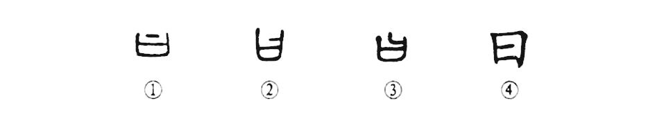 這是子曰詩(shī)云的“曰”字。甲骨文①的下部是“口”,上面的一橫表示說(shuō)話(huà)時(shí)從口中出來(lái)的氣。(也有人說(shuō),一橫是代表說(shuō)話(huà)時(shí)發(fā)出的聲音。)金文②的形體與甲骨文相似。小篆③的形體同于金文。④是楷書(shū)的形體。