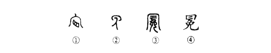 這是“冠冕堂皇”的“冕”字,本為會(huì )意字。①是金文的形體,上部是個(gè)大帽子的形狀,其內為“目”,代表人頭。這就表示人頭上有帽子。②也是一種金文的形體,其下部是面朝左側立的“人”,上部是一頂大帽子。其實(shí),①②就是“免”字,本來(lái)就當“帽子”講??墒堑搅诵∽?,則又在其上增加了一頂大帽子。④是楷書(shū)的形體。
