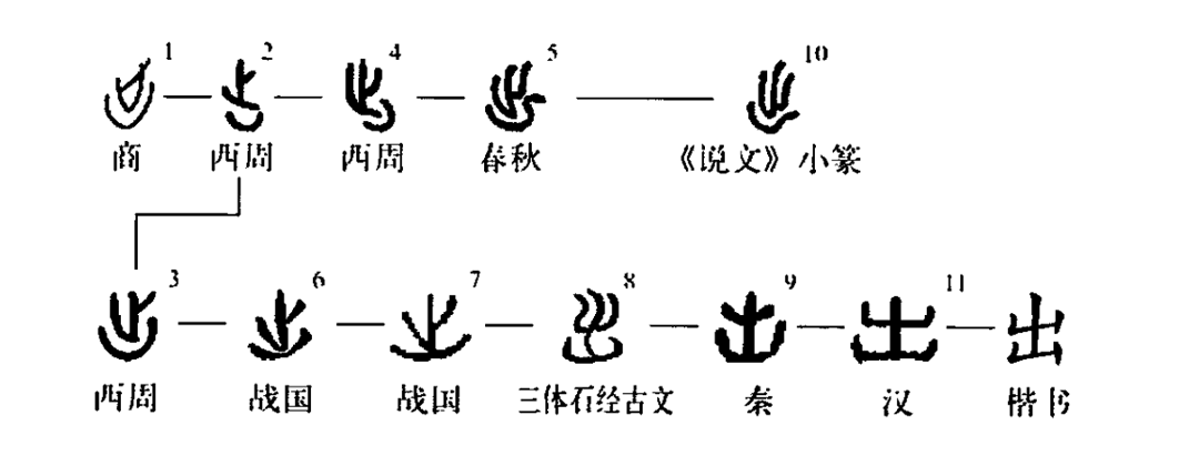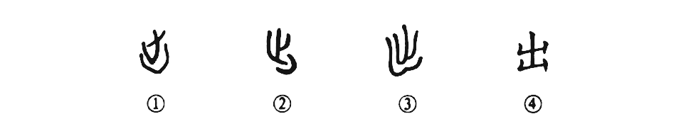 “東邊日出西邊雨,道是無(wú)晴卻有晴。”這是劉禹錫的兩句名詩(shī)。“日出”的“出”字,是個(gè)會(huì )意字。甲骨文①的下部是一條上彎的曲線(xiàn),表示這是一個(gè)門(mén)口或土坑口,上部是一只腳趾朝上的腳,表示一只腳從門(mén)口或土坑口走出的樣子。金文②也是這個(gè)意思,只不過(guò)那個(gè)門(mén)口或土坑口偏到右邊了。小篆③發(fā)生了偽變,腳像個(gè)“山”字形,下面的門(mén)口或土坑口則仍能看出個(gè)大概??瑫?shū)④則變成了兩個(gè)“山”字的重疊形。