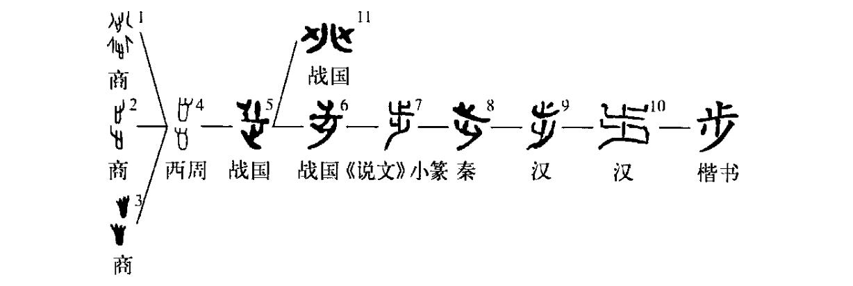 皆足之象形,左右異向者,一像左足,一像右足,“步”字像左右二足前后相承之形。甲骨文或從“行”旁,示在道路上行走之義。其本義就是行走。《乙》4693:“丙午卜,殼貞:翌丁未王步?”《書(shū)·武成》:“王朝步自周。”孔傳:“步,行也。”均用本義。引申出徐行、追隨義。古時(shí)一舉足叫跬(半步),兩足各跨一次叫步。由此引申為步伐、步驟義,亦引申用為長(cháng)度單位。中山王兆域圖:“從內宮至中宮卅六步。”今指行走時(shí)兩腳之間的距離?!墩f(shuō)文·足部》有“踄”,訓“蹈也”,蹈、行同義,“踄”與“步”當為一字,“步”為象形字,“踄”疊加義旁“足”字?!吨猩酵跽子驁D》“步”字兩止左右并列,形意略有訛變。(陳英杰)