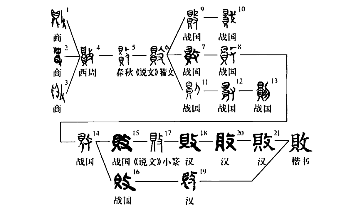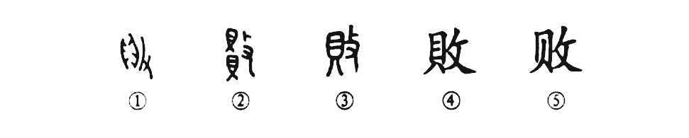 會(huì )意兼形聲字。從攴、貝(貝亦聲)。表意偏旁攴為手持器械以擊狀,貝為古代貨幣貝殼之象,二者結合會(huì )毀壞意。敗與貝聲韻并同。商代甲骨文已出現,構意微別?;驈年窂亩鼎后訛作貝,參“貞(貞)”字條],或從手持貝與從手持貝相撞,或從攴貝,三者構意有別,然皆得會(huì )毀壞意。從西周到春秋(包括《說(shuō)文》籀文)統一作從攴擊上下兩貝。至戰國則異形突出,攴旁或作殳、戈、刀、又,然此更替皆無(wú)妨于表意;至于作