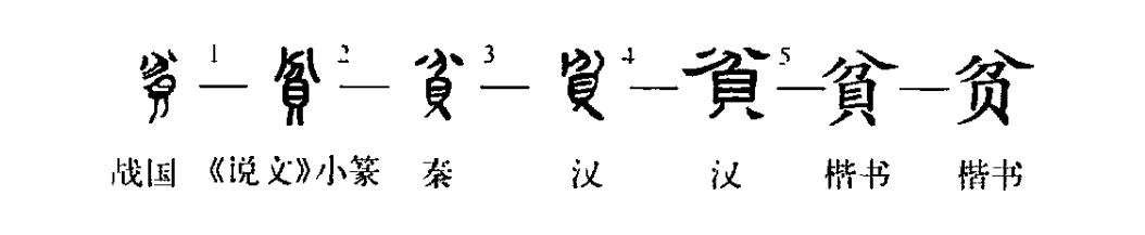“富貴不能淫,貧賤不能移。”這個(gè)“貧”字是會(huì )意兼形聲的字。①是《說(shuō)文》中古文的形體,其外為大屋之形,其內為“分”,分什么?什么也沒(méi)有,故為“貧”。商承祚先生認為:“去貝則貧,此存分之意而取無(wú)貝之實(shí)也。”②是小篆的形體,變成形聲字。其上為“分”,表聲,其下為“貝”,表形。③是楷書(shū)繁體字。④為簡(jiǎn)化字。