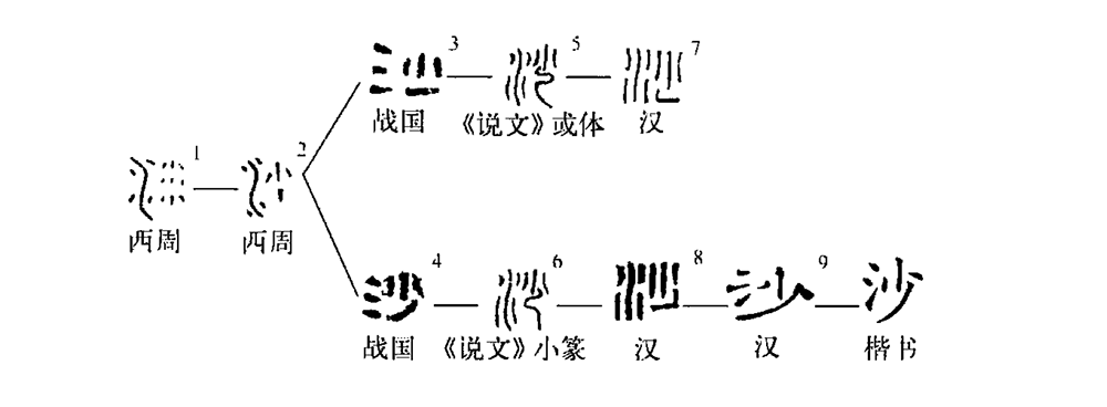 初文為合體象形字。像水及散碎沙粒之形。水旁數點(diǎn)本即沙形,恐沙形不顯,故從水,似亦兼具會(huì )意之義。金文與甲骨文大體同,唯表示沙粒的點(diǎn)數多寡之異。戰國文字形體漸趨統一,易象形為會(huì )意。《說(shuō)文》:“沙,水散石也。從水,從少,水少沙見(jiàn)。”段玉裁注:“石散碎謂之沙。”當為后起之義,亦會(huì )意之屬。本義為沙。后用為沙地、沙漠及泛指細碎松散之物,皆引申義。又用為河流名、地名等。沙或從“尐”,于義無(wú)別。