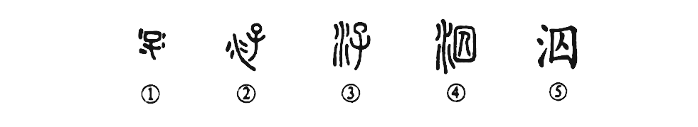 這是“泅水過(guò)河”的“泅”字,讀作(qiú),本為會(huì )意字。①是甲骨文的形體,“子(人)”的周?chē)撬?,就像人潛入水中。②是古璽文的形體,左為“水”,右為“子”,表示人浮于水上。③是小篆的形體,與古璽文極相似。④是小篆的異體字,由會(huì )意字變?yōu)樾温曌?。⑤為楷?shū)的寫(xiě)法。