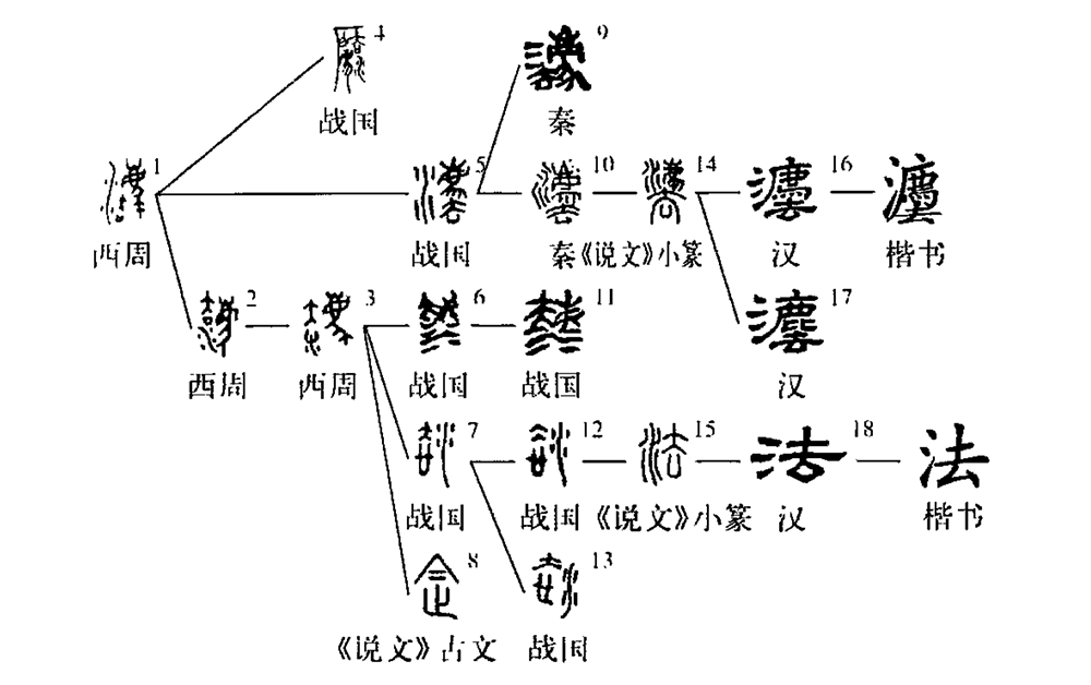 形聲字。從水(表示執法須公平如水),從廌(傳說(shuō)中可以辨別是非曲直的動(dòng)物),去聲(去聲古音兼屬葉部和魚(yú)部,這里取葉部讀音)。1和2為初文,部件的相對位置比較靈活。在字形發(fā)展的過(guò)程中,除了一脈相承維持初文結構基本不變的字形如7、12、13、15外,該字形體上的演變也有簡(jiǎn)化和繁化、訛混三種情況。簡(jiǎn)化的情況又分兩種:一是部件基本具備,而寫(xiě)法漸趨草率,如3、5、8等。其中3的寫(xiě)法特殊,實(shí)際上是聲旁去下部的口形與形旁水的上部共用部件凵(口的變形),是古文字發(fā)展過(guò)程中常見(jiàn)的借筆現象。二是省去構件,如6、9,省去了意符廌。繁化的情況如4,是增加一個(gè)部件“戶(hù)”。有的學(xué)者以為是從?聲,這應該是比較合理的解釋。訛混的情況如14。漢代隸書(shū)字形中廌或寫(xiě)作鹿?!墩f(shuō)文》古文為