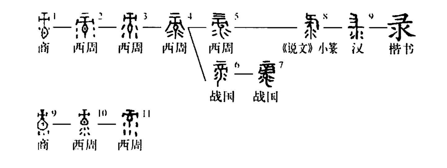 鐘:“授余純魯、通錄(祿)、永令(命)、眉壽、靈終。”(《集成》1.247)今也用為“録”的簡(jiǎn)化字。(王志平)