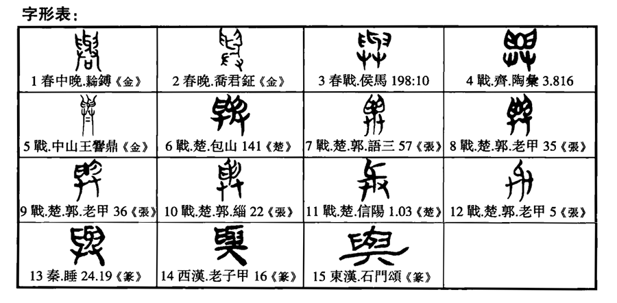 六書(shū):《說(shuō)文》以為會(huì )意。段注指出“舁”、“與”皆亦聲,即“與”為初文加聲的兩聲字。