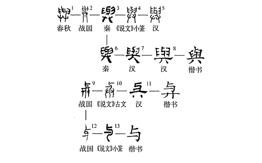 雙聲字。《說(shuō)文》:“與,黨與也。從舁,從與。舁,古文與。”“與”字本從“舁”聲和“牙”聲。戰國文字把所從的“舁”簡(jiǎn)化為“収”。“與”或“