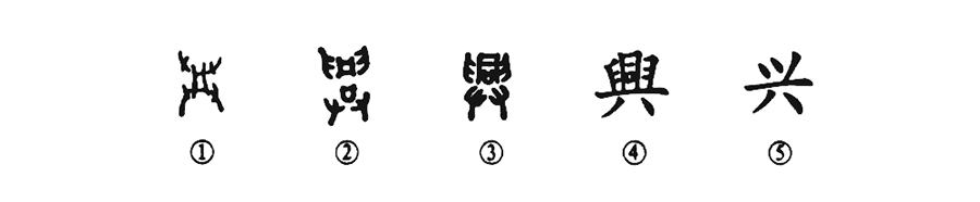 這是“振興中華”中的“興”字。甲骨文①的四角是四只手,中間抬著(zhù)一個(gè)“井”字形的器物,可見(jiàn)“興”就有抬舉之義,是個(gè)會(huì )意字。金文①又增加了一個(gè)“口”字,表示用口叫喊、共同抬舉之義。《說(shuō)文解字》說(shuō):“興,起也。……從同,同力也。”③是小篆的形體,中間“同”字的形體更為明顯。④是楷書(shū)的寫(xiě)法,是由小篆③直接演變而來(lái)的。⑤是草書(shū)楷化的簡(jiǎn)化字。