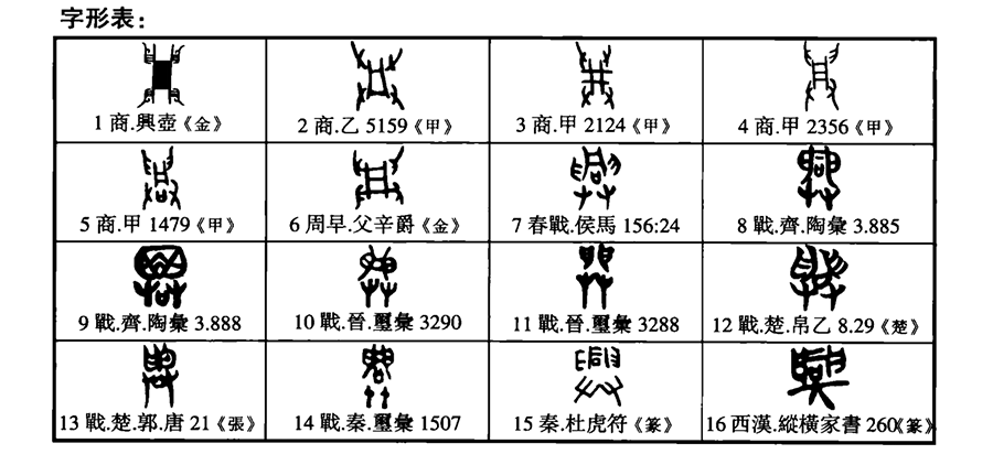 釋形:殷金文、甲骨文從舁、從凡,會(huì )四隻手抬起架子的意思。後“凡”下加“口”形,《說(shuō)文》遂以為從“同”。戰國文字“凡”形、“口”形變化較多。